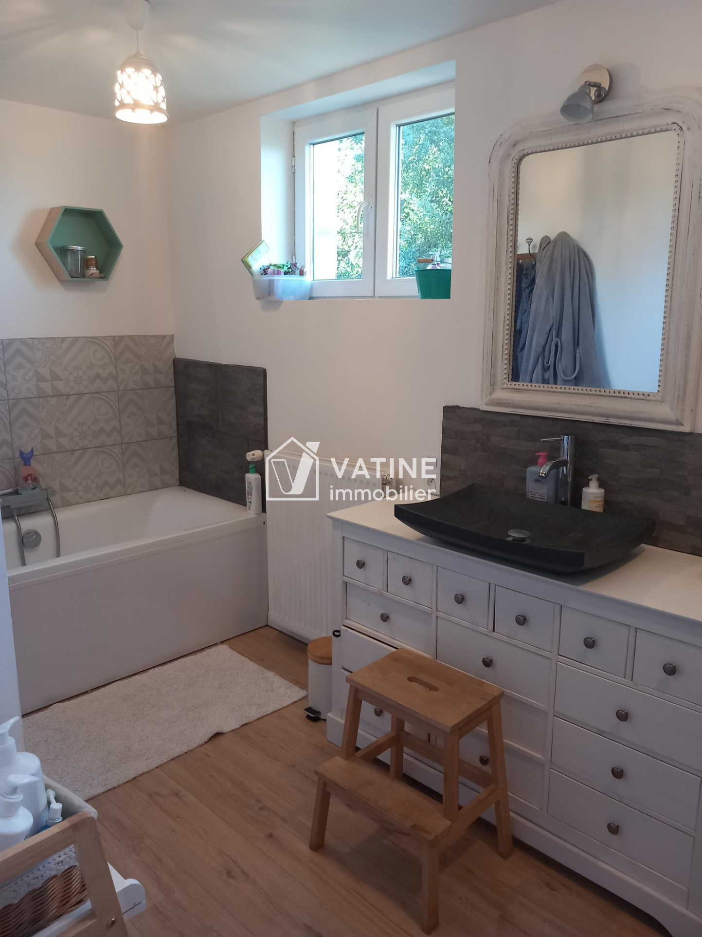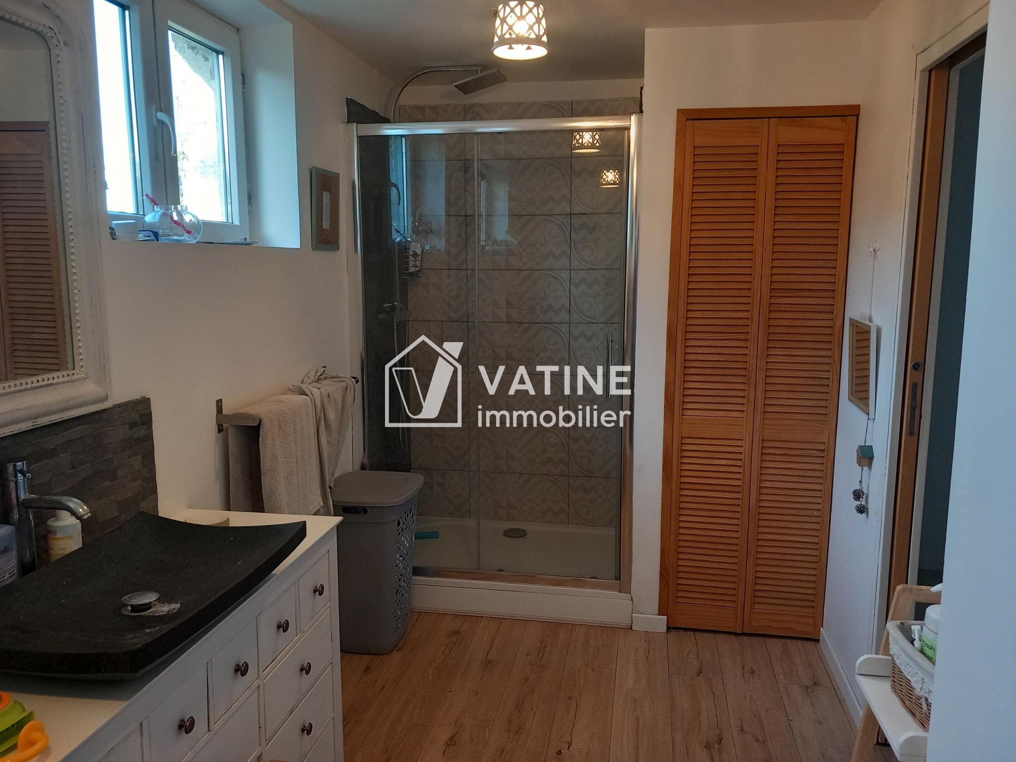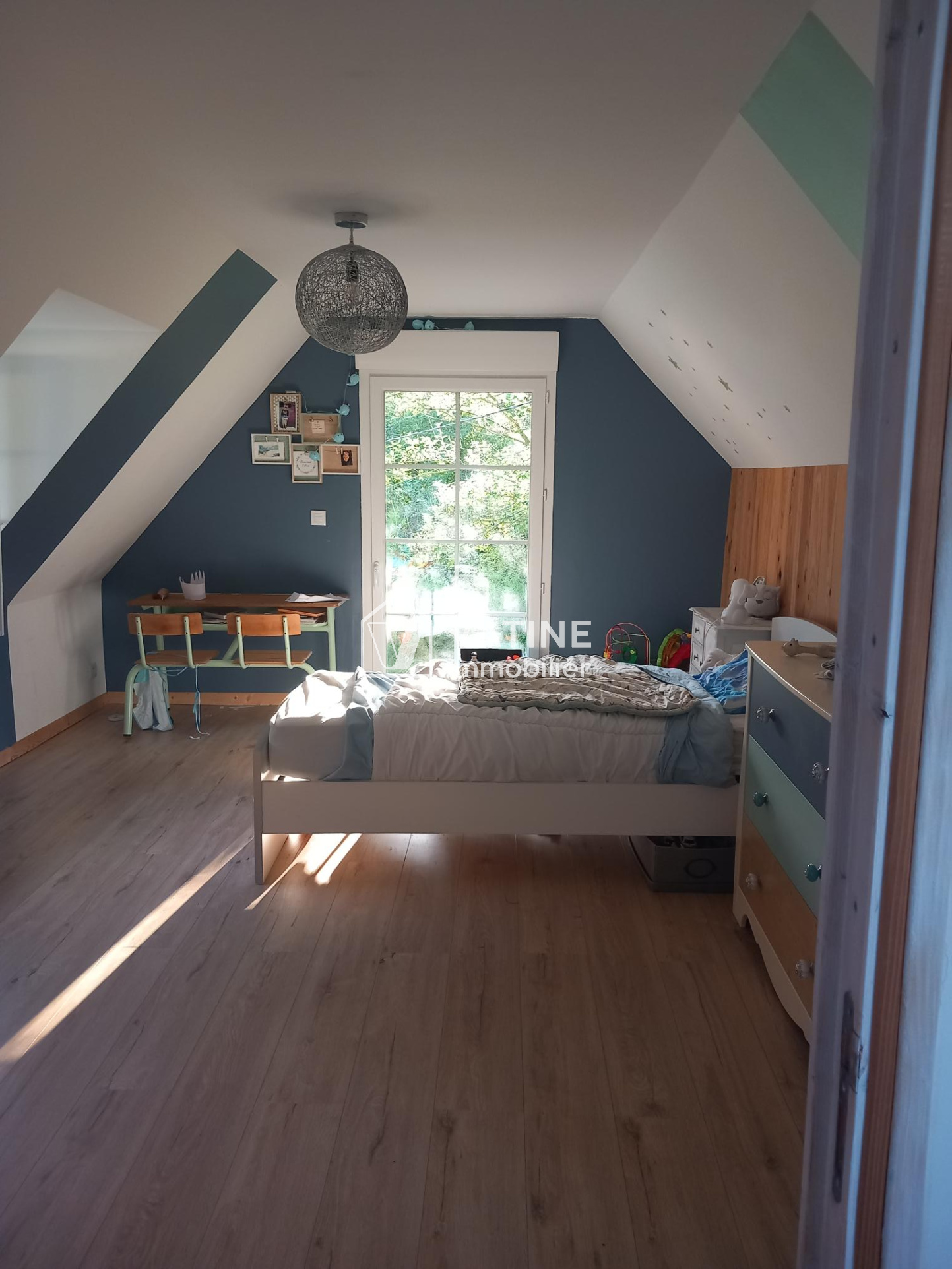 À l’étage, un palier dessert deux chambres, une salle de douche avec WC, ainsi qu’un grenier aménageable.Rénovation récente, chauffage central par pompe à chaleur récente, double vitrage, assainissement individuel, garage, autre garage/préau d’environ 40 m² avec grenier, de construction traditionnelle et récente.