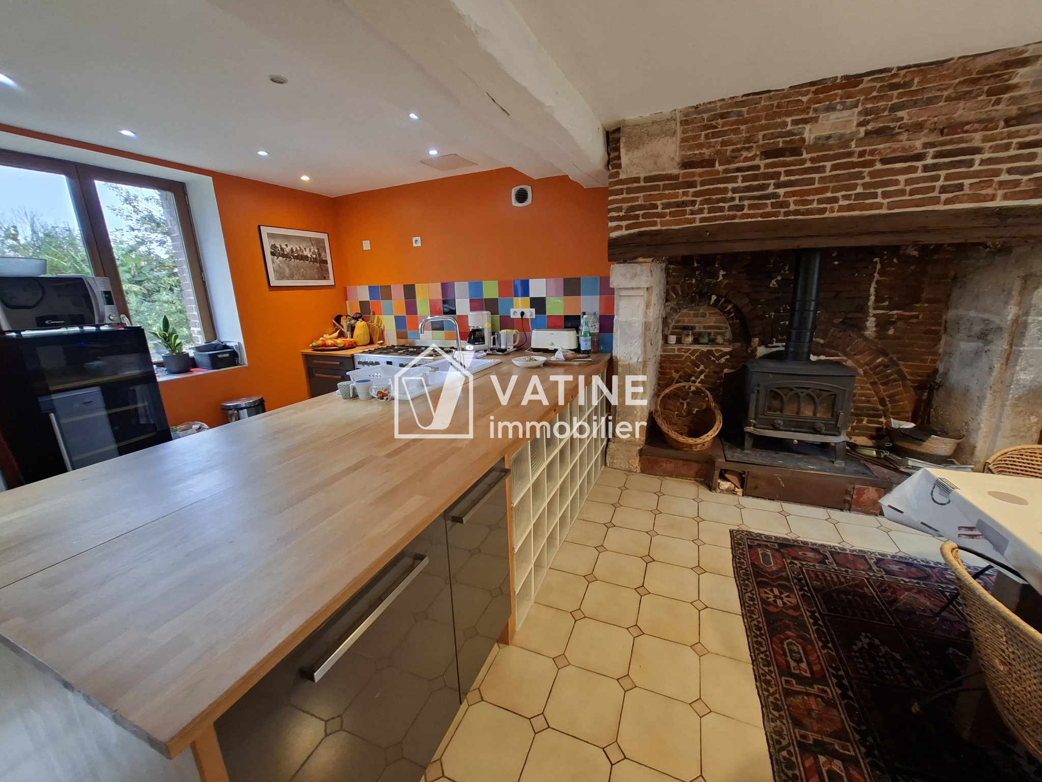 L’entrée dessert un vaste salon lumineux et une grande cuisine/salle à manger avec une cheminée cauchoise agrémentée d’un poêle à bois, créant une atmosphère conviviale. Le rez-de-chaussée comprend également un bureau ou chambre, un grand cellier, un WC indépendant, ainsi qu’un accès à la belle cave en pierre. À l’étage, vous trouverez quatre belles chambres baignées de lumière, une salle d’eau rénovée avec WC, ainsi qu’une future salle de bain à terminer, offrant un joli potentiel d’aménagement. Le grenier est également disponible pour rangements ou projet d’aménagement.