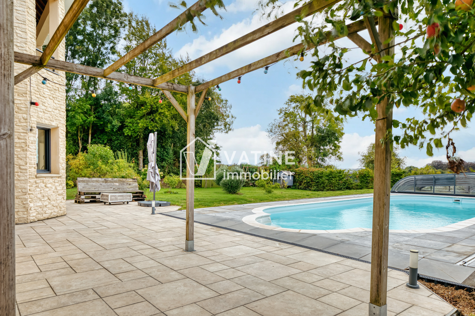 A l'exterieur, pour vos longues soirées d'été vous trouverez une piscine récente de construction traditionnelle chauffée au moyen d'une pompe à chaleur couverte par un dome coulissant de bonne qualité très récent.